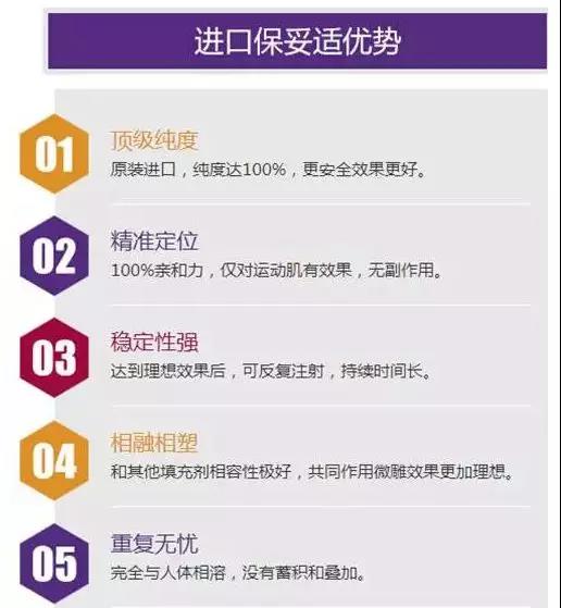 产品简介:BOTOX的主成分为高度纯化的保妥适素a型,是一种神经传导的阻断剂,用以治疗过度活跃的肌肉,可以让肌肉放松,肌肤变得紧致、平滑、年轻。近几年在国际上非常流行,适用于想要美丽却害怕手术的人。BOTOX**性高,操作方便,注射后**微创**,**,维持时间久,且不用做任何按摩或特殊护理,甚受求美者欢迎与喜爱。